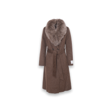 Invento Fashion Elegantni vuneni braon kaput sa krznenom kragnom i pojasom